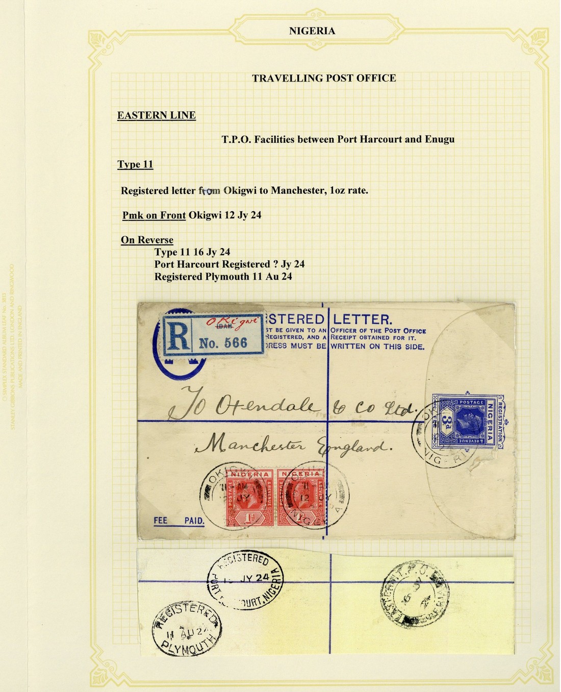 1924 (12 July) 3d. registered envelope from Okigwi to Manchester, uprated with 1d. (2), showing provisional registration label and, on reverse, "eastern t.p.o./nigeria" double-ring d.s. (Type D2)1924 (14 July) envelope registered from Awgu to Manchester, bearing 1d. (5) and showing red ink registration marking and with similar backstamp; 1929 (3 Aug.) 3d. registered envelope from Agbiam to Huddersfield, uprated with 2d., cancelled by "agbiam/nigeria" double-ring d.s. (Type D2; very scarce) in blue and "eastern t.p.o./nigeria" double-ring d.s.; also 1931 (21 Sept.) 1½d. stationery envelope from Umuahia to London and showing Port Harcourt transit d.s. on reverse which means this cover travelled on the railway