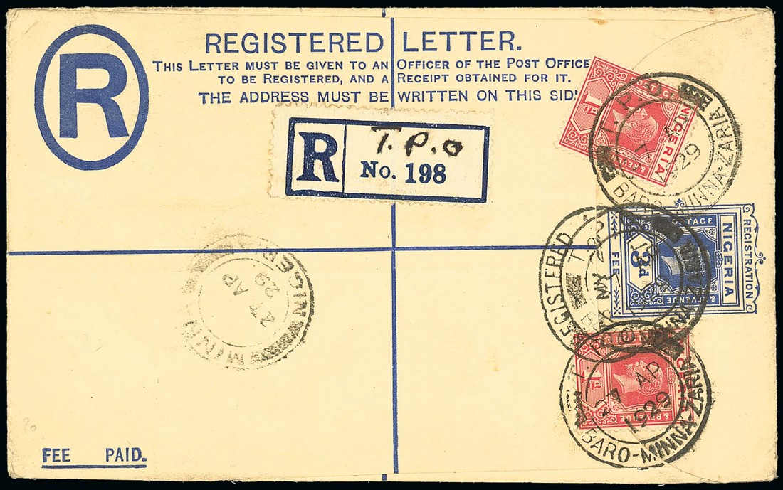 1929 (27 Apr.) 3d. registered envelope to Bristol, uprated with 1d. (2), all cancelled by "t.p.o./baro-minna-zaria" double-ring d.s. (Type D2), showing blank registration label with manuscript "T.P.O." and Minna transit d.s. (27.4). Rare. Photo