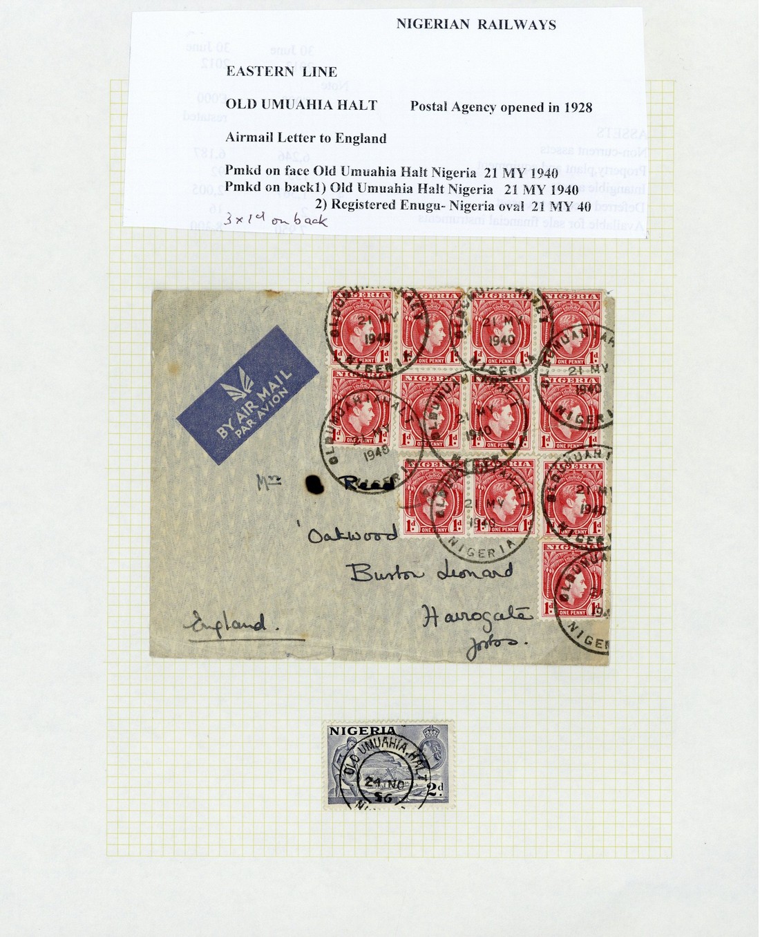 1940-62 envelopes (23, four registered) and loose stamps/pieces (11), variously addressed and franked, and showing a range of cancellations including Aba, Afikpo Road, Bukuru, Eha Amufu, Gudi, Igumale, Kagora, Mada, Old Umuahia Halt, Otobi, Taraku, Udei Umuahia, Zonkwa and six, from Enugu, Jos, Kano, Lagos, Minna and Zaria, with straight-line "posted on train" h.s. An interesting lot