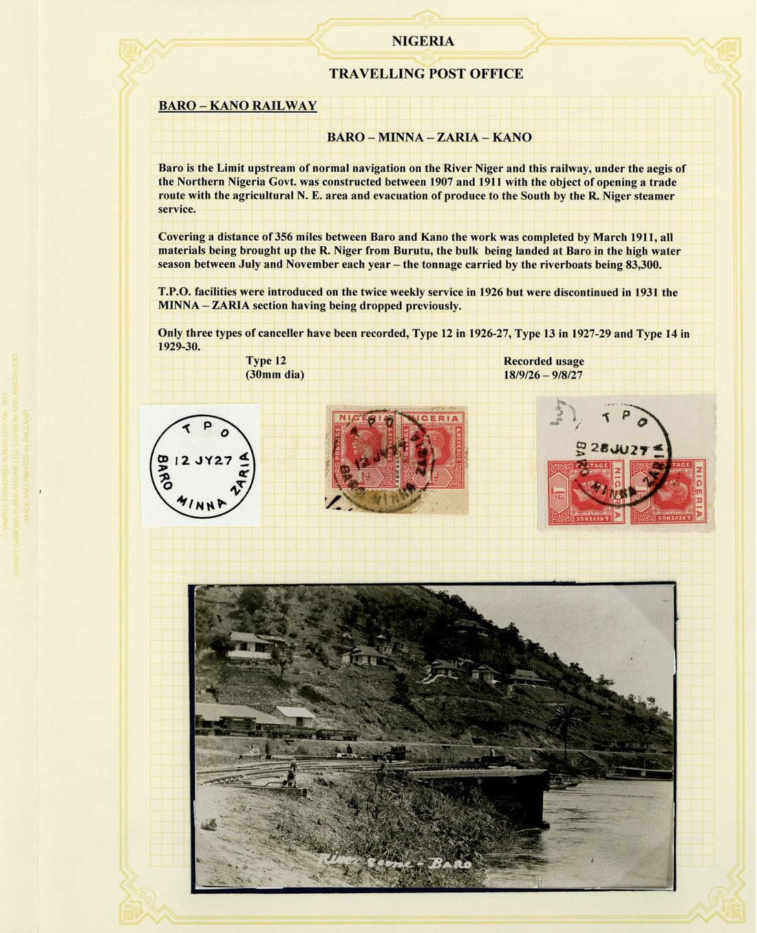 A small range of cancellations on loose adhesives/pieces (17) including manuscript "Badeggi" (2) on Northern Nigeria ½d. pair and 1d., "t p o/baro minna zaria" single-ring d.s. (2), "t.p.o./baro-minna-zaria" double-ring d.s. (3), "t.p.o./minna - baro" double-ring d.s. (4), "landing stage/lagos/nigeria" c.d.s. (2) and "landing stage/lagos nigeria" c.d.s. (2). A scarce lot
