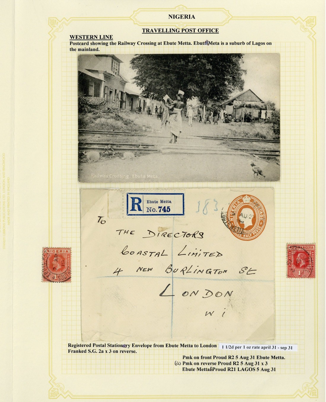 1911-36 envelopes (5, one registered and one Official), stationery envelopes (3, two registered and one incoming from Transvaal) and registered envelopes (4), picture postcard and loose adhesives/pieces (10), all carried on the Western Line with the covers showing cancellations of Abeokuta, Ebute Metta, Ife, Ilaro (2), Kaduna Junction S.O., Kaduna North, Kaura Namoda, Kano, Offa, Ringim and Zungeru. An interesting lot worth viewing