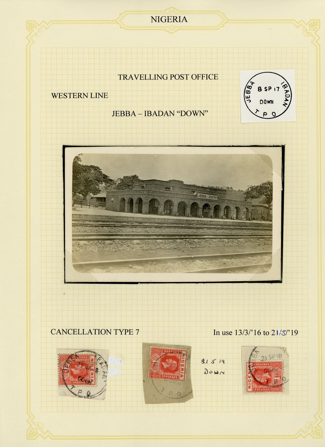 1917 (10 Sept.) envelope from Ilorin to London bearing Southern Nigeria ½d. pair and showing, on reverse, fine "jebba ibadan/ t p o" c.d.s. (Type D3) and Lagos transit d.s.; also photographic postcard (3, two coloured) of Jebba including South Station and North Channel railway bridge, and four small pieces with part strikes of the datestamp