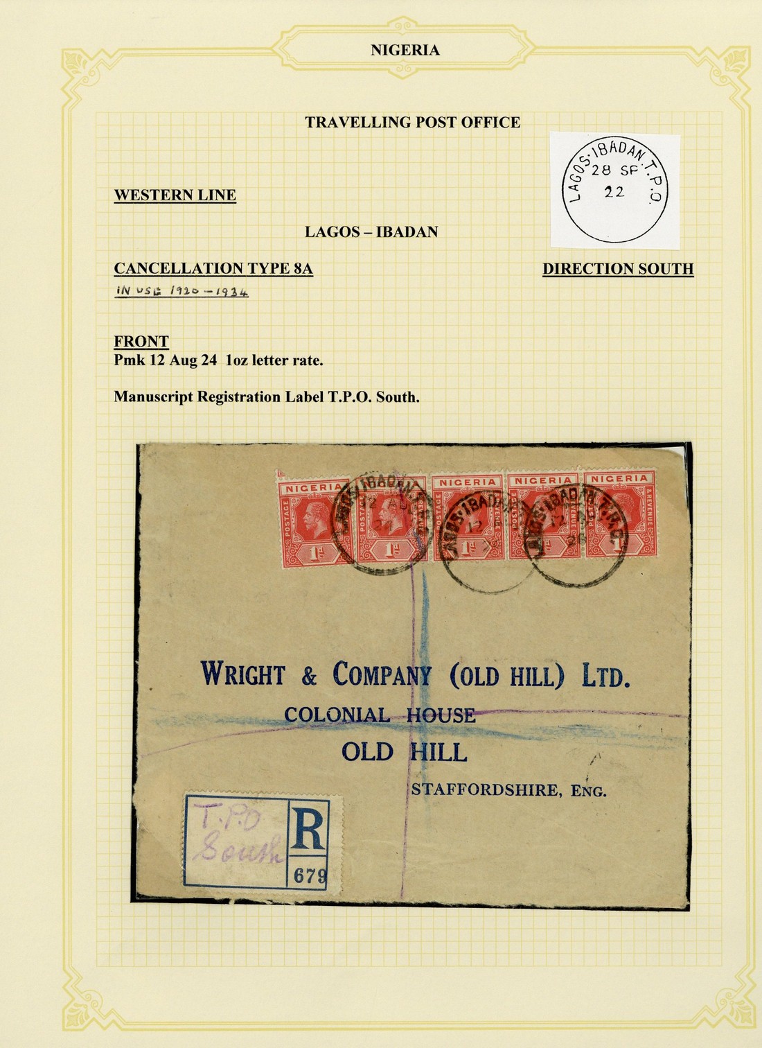 1924 (12 Aug.) envelope registered to England, bearing 1d. (5) tied by "lagos ibadan t.p.o." c.d.s. (Type D5) without direction and showing blank registration label with manuscript "T.P.O. South"; and 1926 (21 Apr.) 3d. registered envelope to Leicester, uprated with 1d. (5) tied by legible "lago ibadan t.p.o." c.d.s. (Type D5) without direction and showing violet crayon "T.P.O. South" registration marking. A fine pair