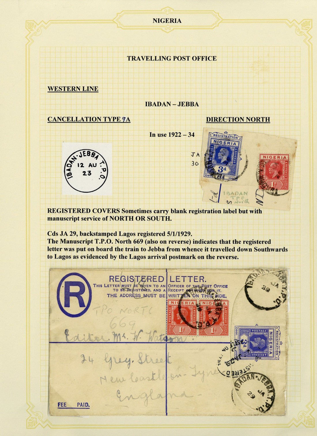 1927 (23 Aug.) envelope registered from Ife to Birmingham, bearing ½d. (10) and showing, on reverse, "ibadan jebba t.p.o." c.d.s. (Type D7) without direction; and 1929 (Jan.) 3d. registered envelope to Newcastle, uprated with 1d. pair tied by "ibadan jebba t.p.o." c.d.s. (Type D7) without direction, and showing manuscript "TPO North" registration marking