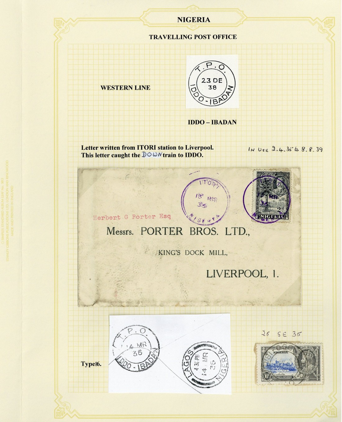 1935 (19 Dec.) 3d. registered envelope (soiled) to Chicago, uprated with 1½d. (2), cancelled by "t.p.o./iddo-ibadan" double-ring d.s. (Type D7) and showing blank registration label with manuscript "TPO South"; 1936 (13 Mar.) envelope (soiled) from Itori to Liverpool, franked at 2d. and backstamped with "t.p.o./iddo-ibadan" double-ring d.s. (Type D7); 1937 (27 Oct.) envelope to Ibadan, bearing Coronation 3d. cancelled by "t.p.o./iddo-ibadan" double-ring d.s.; and 1939 (7 June) envelope from Bida to Ilorin, bearing 1d. and showing similar backstamp. An interesting group
