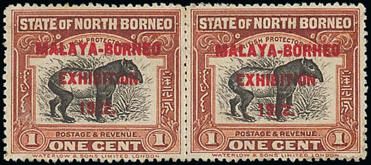 1922 Malaya-Borneo Exhibition 1c. black and brown with red overprint, perf. 14½-15, a horizontal pair with the right-hand stamp showing variety "borheo", unused with part original gum; a fraction soiled and perfs. concertina'd between, otherwise sound. Scarce. S.G. 253fa, £500. Photo