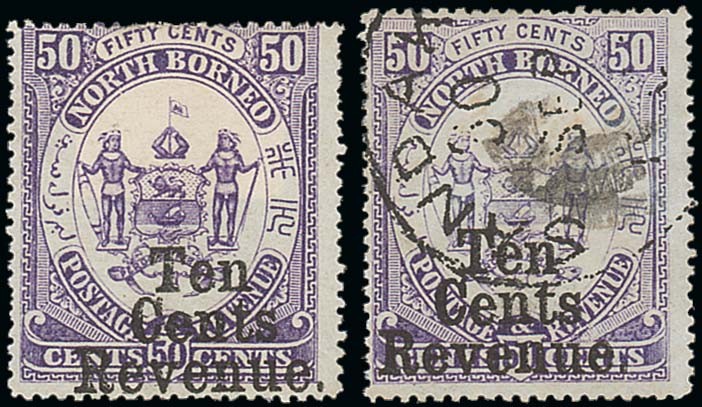 1886 10c. on 50c. violet, variety no stop after "Cents" and stop after "Revenue", fresh with part original gum, natural horizontal crease; also a "used" example with reduced pen mark and forged Sandakan c.d.s. S.G. F3b, £550+. Photo