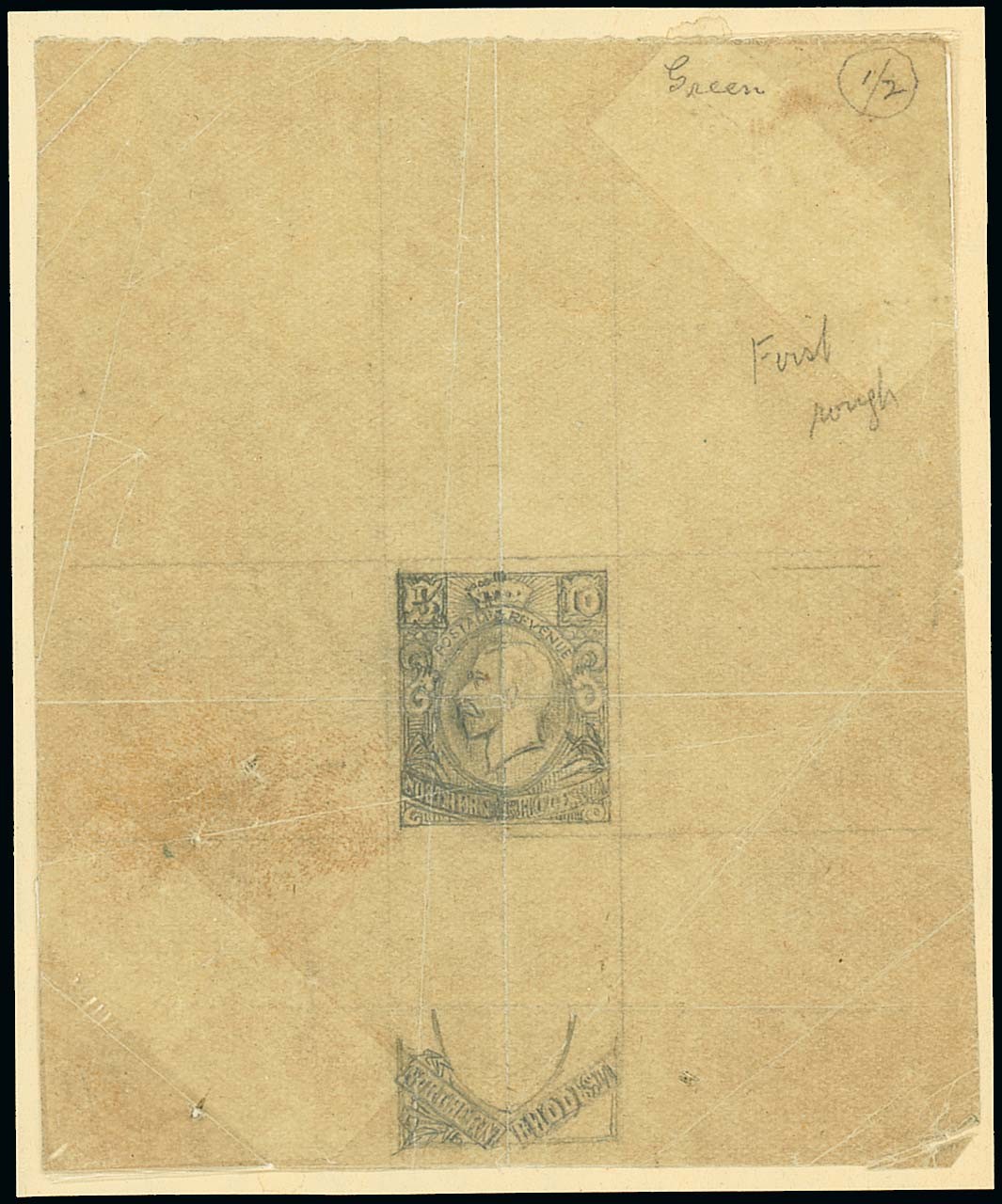 Pencil sketch essay showing the King facing left with Crown, "½" and "10" value tablets and with a second part drawn sketch below showing an alternative design for the lower ribbon, the whole on tracing paper (83x102mm., creases) marked "Green (½)" and "First rough". Unique. Photo