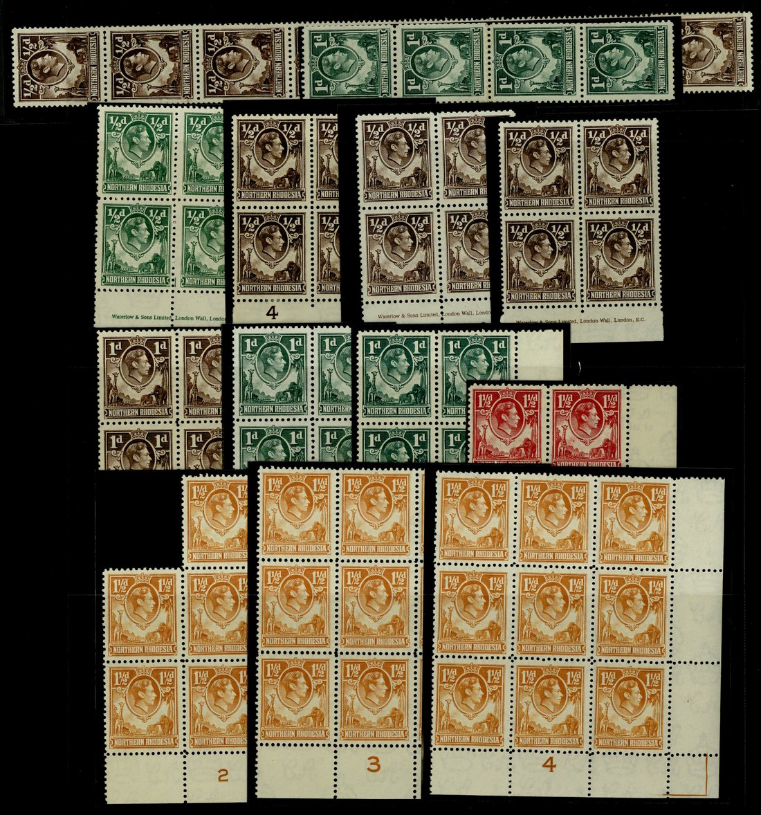 A mint range of multiples to 9d., including most values in imprint blocks of four, a few in plate blocks with 1½d. yellow-brown Plates 2, 3 and 4, ½d. chocolate perf. 12½x14 strip of fourteen with coil join, 1d. green perf. 12½x14 strip of four with coil join, and 1½d. red marginal block of four; very fine to superb unmounted mint. (132)