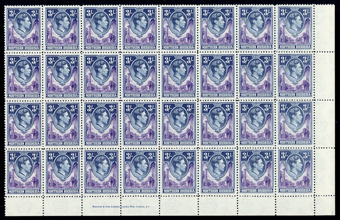 3/- violet and blue lower right corner block of thirty-two (8x4) with imprint, showing guide marks between R.7/5 and R.7/6, and R.9/4 and R.9/5, "t" in Crown R. 8/10 and Tick on left elephant R.10/5, superb unmounted mint