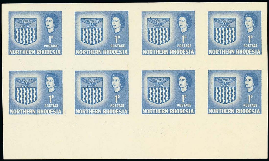 1d. Lusaka trial printing imperforate marginal block of eight in pale grey-blue on gummed wove paper. A rare large multiple. Photo