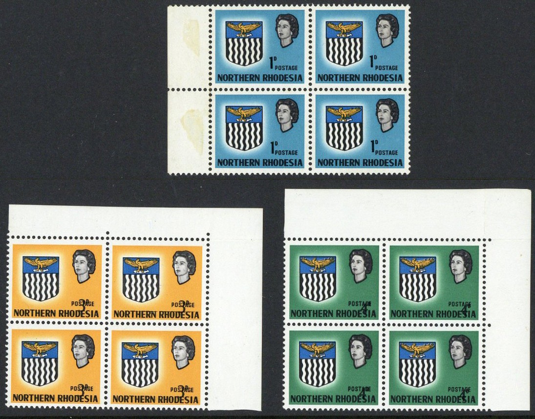 1d. marginal block of four, 3d. and 4d. upper right corner blocks of four, all variety value shifted to foot, the 1d. diagonally so, unmounted mint with the 1d. block only mounted on face of margin. A scarce trio