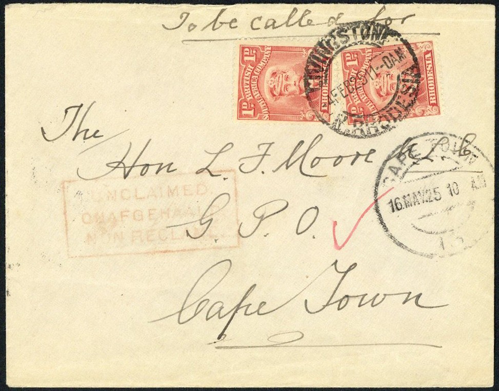 1925 (4 Feb.) envelope from Livingstone to Cape Town and marked "To be called for", bearing Admiral 1d. pair with c.d.s. and showing tri-lingual "unclaimed" handstamp in red and Cape Town c.d.s. (16.5), all on face, the reverse with Cape Town Poste Restante c.d.s., Cape Town, Salisbury and Livingstone R.L.O. c.d.s.; interesting and unusual in being returned after the BSAC Admiral stamps were demonitized on 1 April 192,5 though before they were finally withdrawn in Northern Rhodesia on 30 September