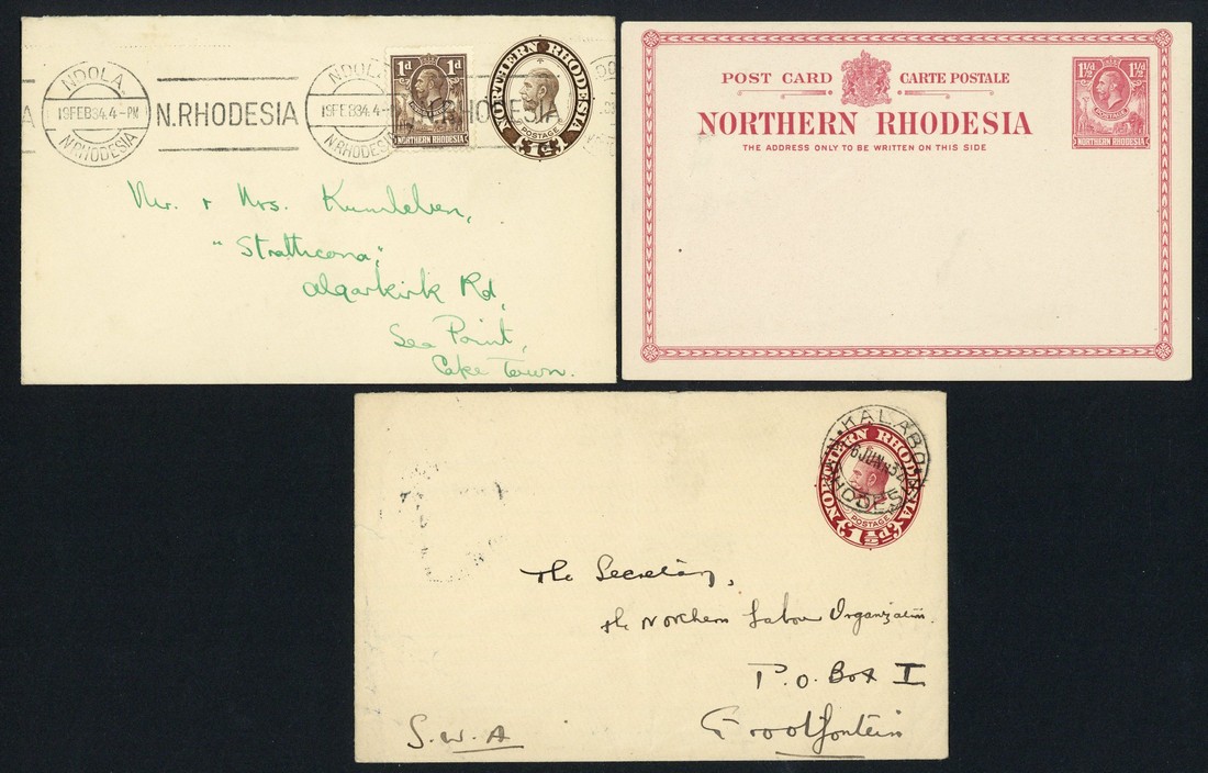 1932 1½d. envelope from Kalabo to Grootfontein, S.W.A. and cancelled by double-ring datestamp and 1934 1d. envelope, uprated with 1d., from Ndola to Cape Town and cancelled by machine datestamp (only used for two years). An attractive pair of commercially used postal stationery envelopes. Also unused 1924 1½d. card showing "damaged ear" variety