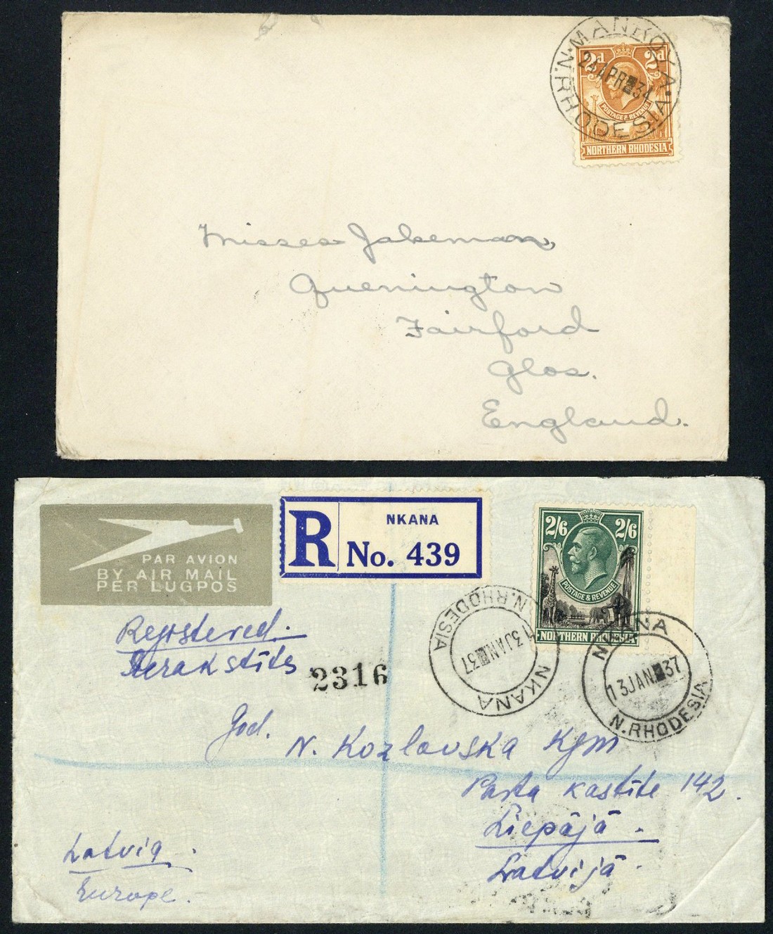1934 envelope from Mankoya to England bearing 2d., 1937 airmail envelope registered from Nkana to Latvia bearing marginal 2/6d., 1939 envelope from Mumbwa to Lusaka bearing 1½d., and 1951-64 envelopes (6) with registered items from Livingstone (1954) and Chipili (1964, rare Hoyte Type 25 c.d.s.)