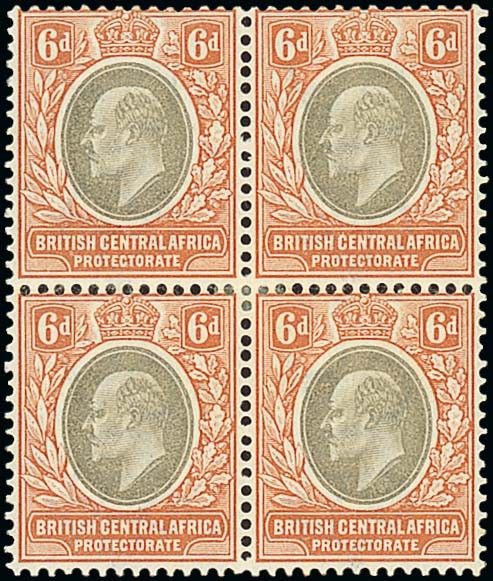 1903-04 CA 6d. grey and reddish buff block of four, variety watermark inverted, fine mint. A rare multiple. S.G. 62aw, £900. Photo
