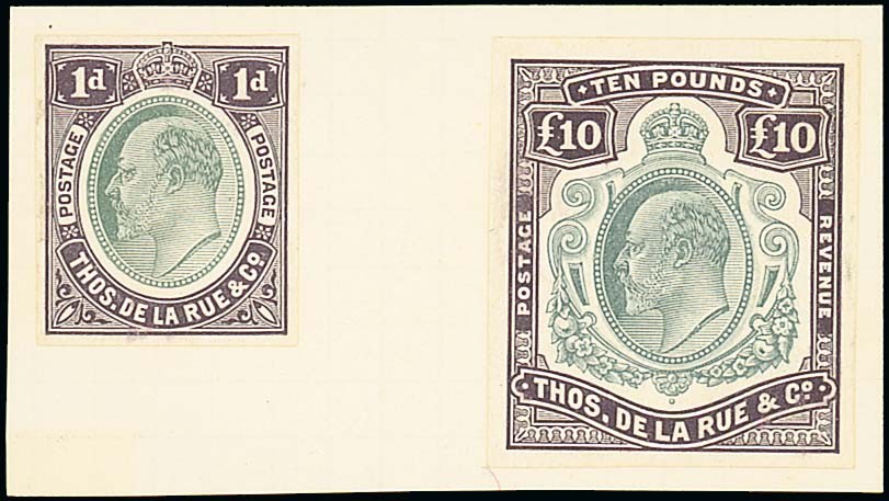Second Series dated 16th December 1907, 1d. and £10, both in grey-green and dull mauve and affixed to small piece, fine. Photo