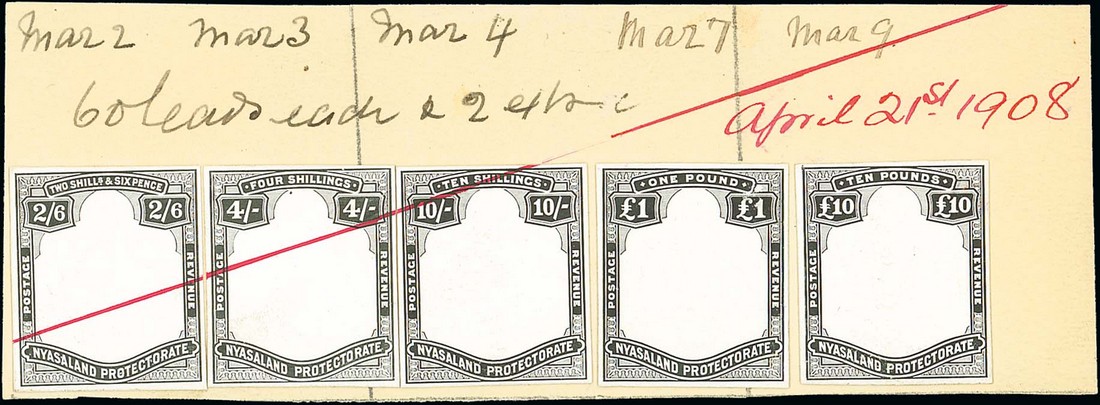 2/6d., 4/-, 10/-, £1 and £10 frames only, all stamp-size in black on glazed card and mounted on single piece of card (153x56mm.) marked "60 leads each & 2 extra", dated between "Mar 2" and "Mar 9", and further dated "April 21st 1908" in red ink with ink line crossing three proofs. Photo