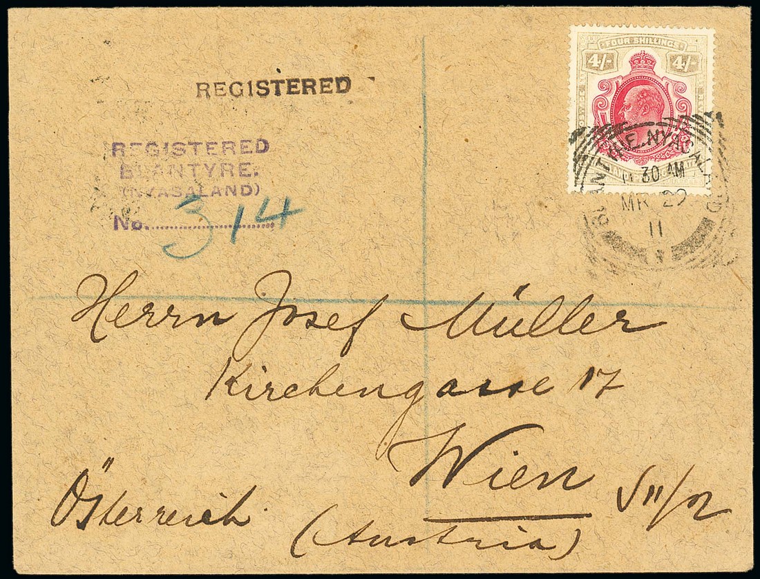4/-black and carmine neatly tied by "blantyre nyasaland" squared-circle d.s. on 1911 (29 Mar.) commercial envelope registered to Vienna, showing violet registration h.s. at left and, on reverse, Chinde (7.4), Zanzibar (13.4), Naples (2.5) and arrival (5.5) datestamps. A rare stamp on cover. S.G. 79. Photo