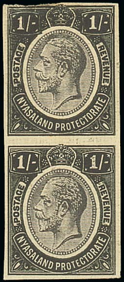 1/- in grey and black, a vertical pair on wove paper with part or full (lower stamp) original gum, fine. Photo