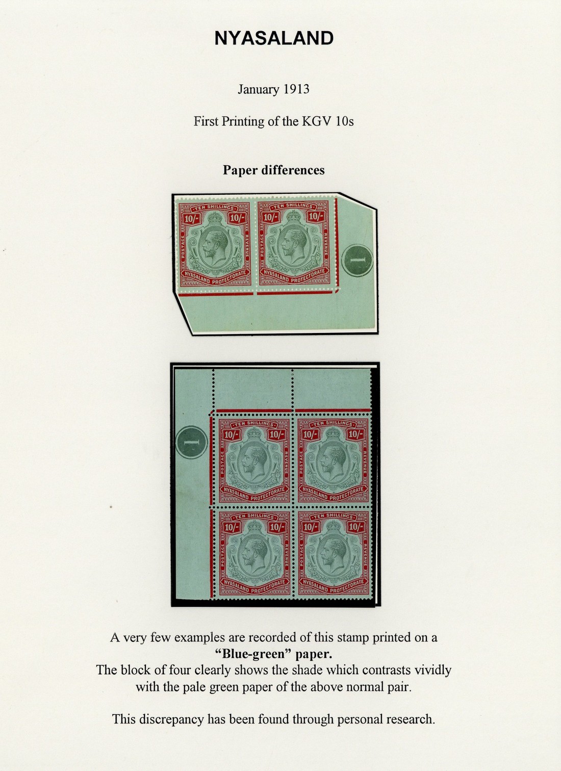 10/- pale green and deep scarlet on green lower right corner pair with plate number, and a top left corner block of four with plate number on blue-green paper, both from the 1st printing (January 1913), fine mint. S.G. 96