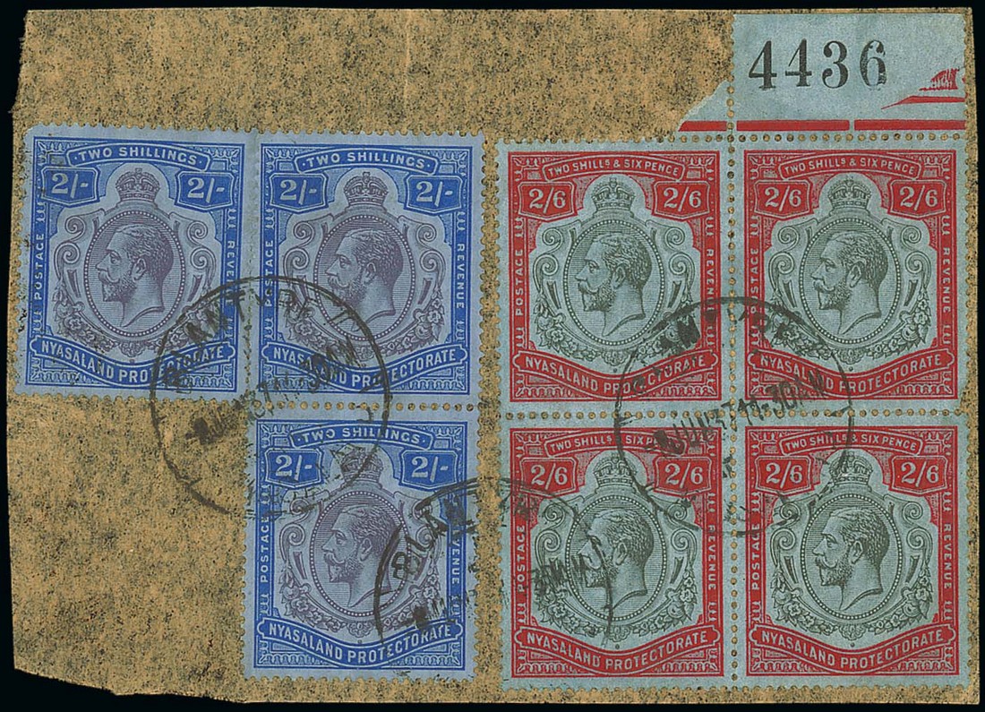 2/6d. black and red on blue from the 3rd printing (September 1927), a block of four [5-6/17-18] with margin above [6] showing sheet number "4436", used with 2/- (3) on piece, all cancelled by Blantyre c.d.s., fine. Very rare, the only recorded used multiple with possibly no more than a dozen other used examples recorded from this printing, and the only sheet number from the third printing recorded. Photo