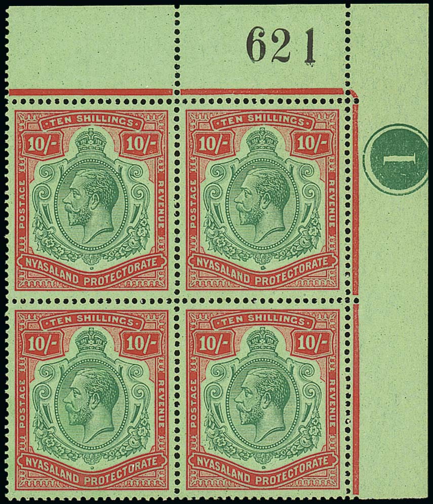 10/- green and red on pale emerald from the 1st printing (October 1926), a top right corner block of four with sheet number "621", [12] showing break in scroll and [24] showing broken crown and scroll, fine mint. Brandon Certificate (2007). S.G. 113/113a/113b. Photo