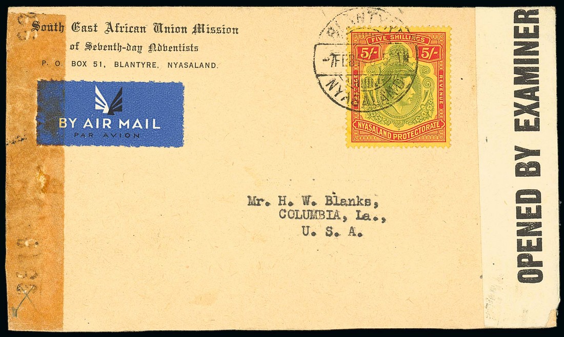 1944 (7 Feb.) envelope to USA bearing 5/- and tied by Blantyre c.d.s., showing despatch Censor label at right and arrival Censor label at left with, on reverse, Leopoldville transit c.d.s. (28.2). A rare commercial franking. Photo