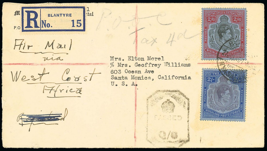 1945 (27 July) envelope registered to California bearing 2/- and 2/6d. tied by Blantyre c.d.s., showing Censor h.s. and, on reverse, Salisbury (28.7), Accra (14.8) and Miami (29.8) transit d.s., marked "P.O.O.C." (Posted out of course) and taxed 4d. A rare commercial franking. Photo