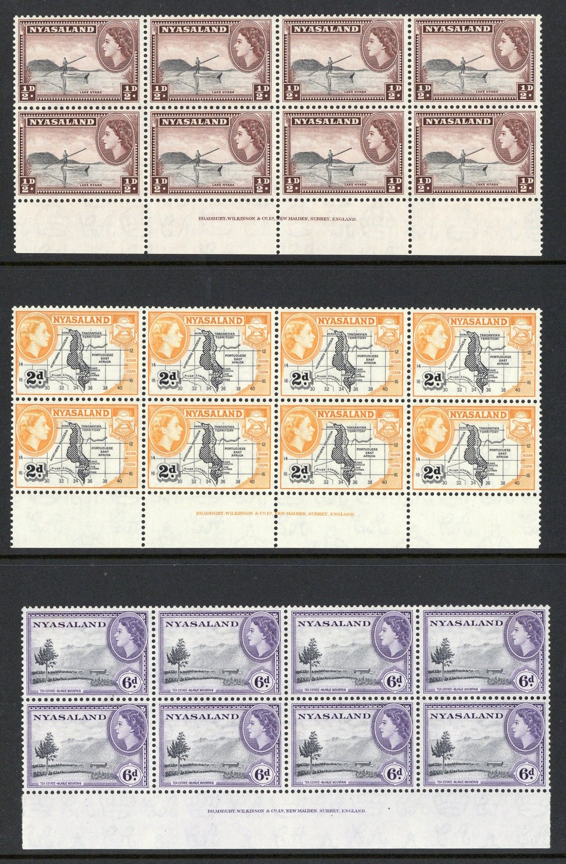1953 perf 12x12½ ½d., 2d. and 6d. marginal blocks of eight (4x2) with imprint at foot, all with comb perforations from sheets intended for coil duties, fine unmounted mint. S.G. 173a, 176a, 180a