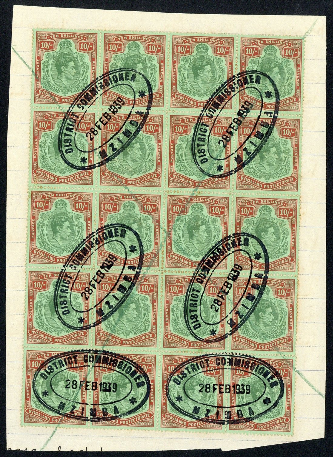 1938 10/- emerald and deep red on pale green block of twenty (4x5) on piece, the block with green crayon cross and all cancelled by large "district commissioner/mzimba" oval d.s. in black for 28 February 1939, fine