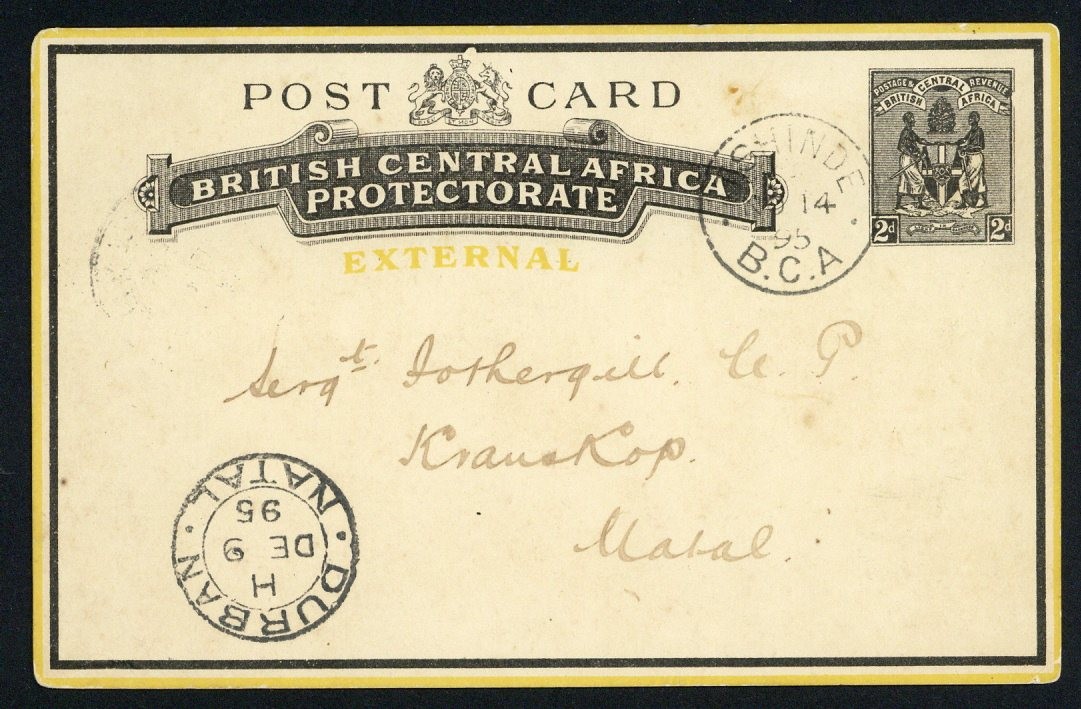 1895 (14 Nov.) 2d. stationery card to Natal, cancelled by "tscinde/b.c.a." c.d.s., showing Durban transit c.d.s. (9.12) in opposite corner and, on reverse, Harmannsburg arrival datestamp