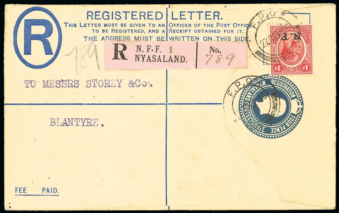 1916 (27 Oct.) 4d. registered envelope from New Langenburgto Blantyre, bearing additional 1d., both cancelled by "f.p.o./1" double-ring d.s., showing "n.f.f. 1" registration label with arrival datestamp (7.3) on reverse. Photo