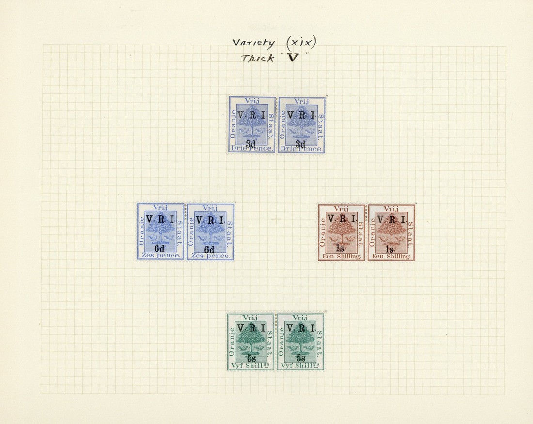 A selection with ½d. on ½d. (2), 1d. on 1d., 2d. on 2d. (2), 3d. on 3d., 6d. on 6d. (both), 1/- on 1/- and 5/- on 5/-, all in pairs or block four (one 2d. on 2d.) with normal, mint; a couple of lower values with a fox mark, the 6d. on 6d. rose partially severed between. B.P.A. Certificate (1956) for 6d. rose pair. Cat. £625+