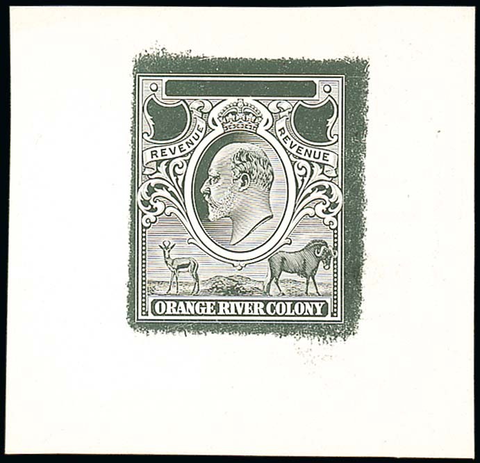 1903 KEVII master die proof with uncleared value tablets and surrounds, in black on glazed card (56x55mm.). Photo