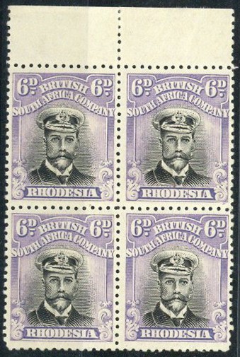6d. jet-black and lilac marginal block of four from the top of the sheet, large "rhodesia" tablets, fresh mint with the stamps remaining unmounted; one with a small corner crease, otherwise fine. S.G. 295 var.
