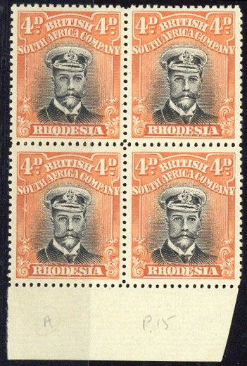 4d. black and orange-vermilion marginal block of four from the foot of the sheet, unmounted mint; small gum tones on one stamp, otherwise fine. S.G. 313