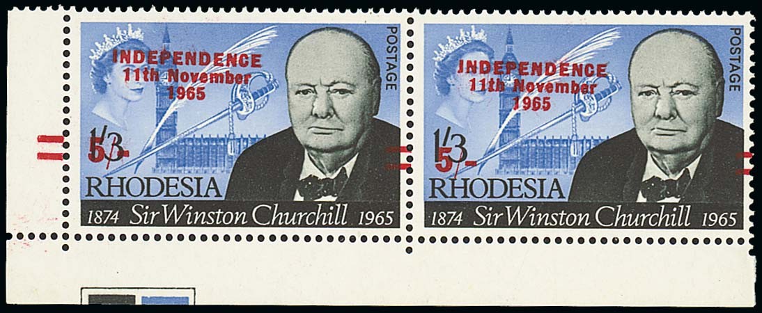 5/- on 1/3d. lower left corner pair showing leftwards shift of the surcharge with the "bars" appearing on the adjacent stamp or in the margin, unmounted mint. Striking and rare with previous recorded examples showing the surcharge shifted upwards. Photo