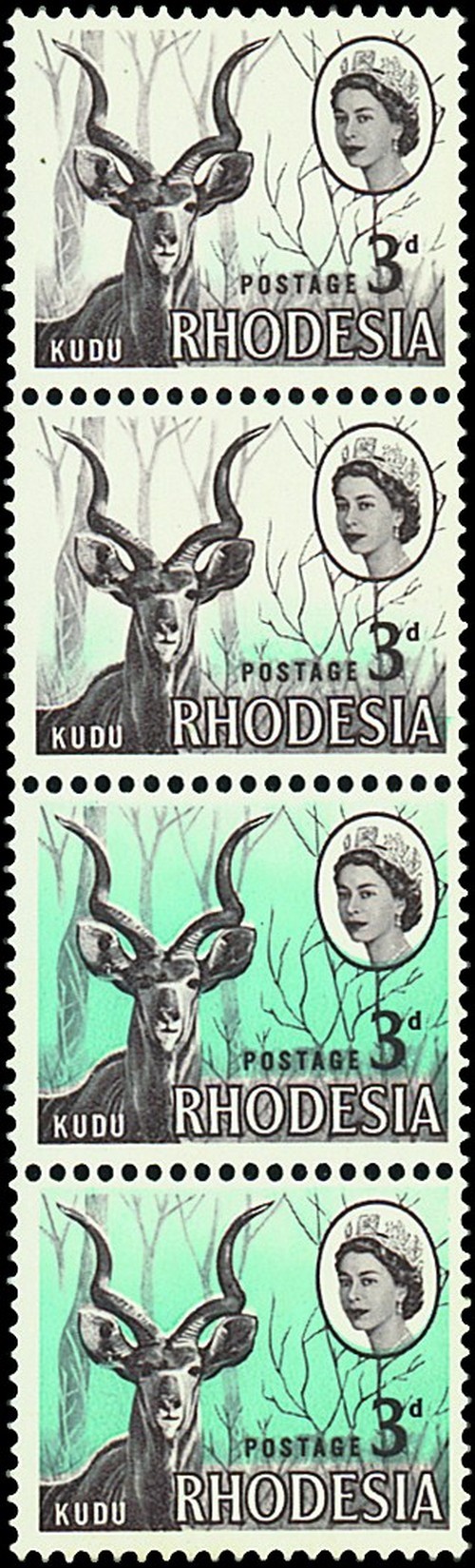 3d. chocolate and pale blue vertical strip of four, the top stamp with variety pale blue almost entirely omitted, the adjoining stamp with pale blue largely omitted, fresh unmounted mint; natural "lines" on gum, nevertheless an appealing variety. Photo