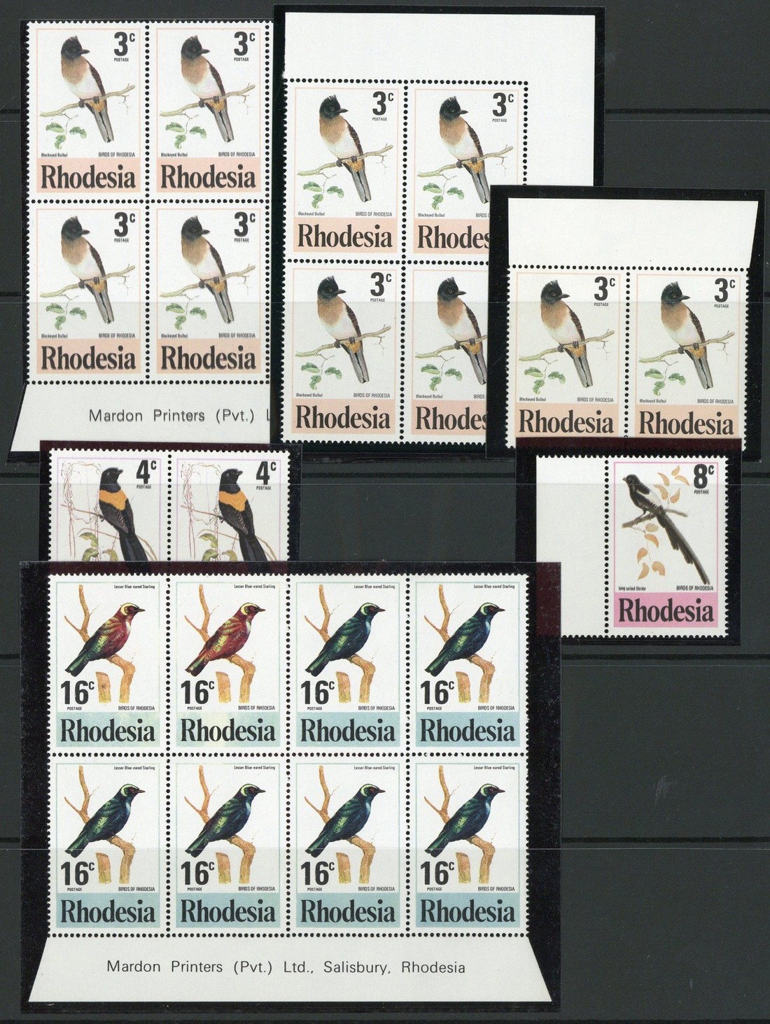A selection of forty-two stamps, largely in pairs, blocks of four or larger, including 3c. imprint block of eight, 4c. pair, 8c. and 24c. all with black printing double, 16c. imprint blocks of eight (2), one showing two stamps in the top row partially red, the other with it less so, and 16c. marginal pair with shift of perforations to top; fine unmounted mint