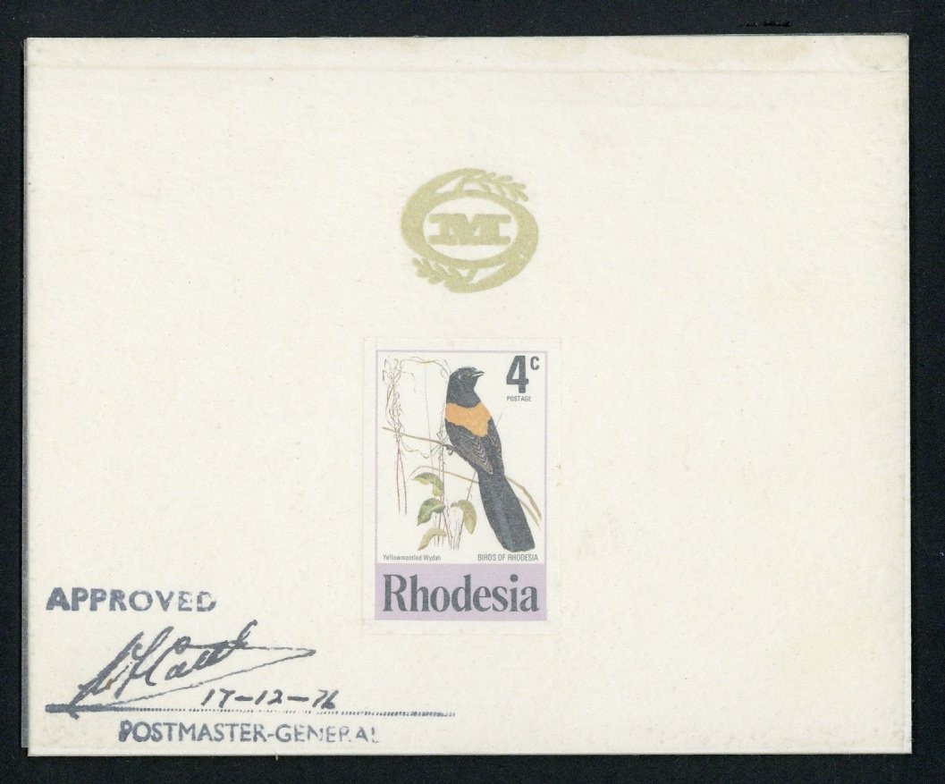 4c. imperforate proof affixed to white Mardon presentation card signed Approved by the Postmaster-General on 17 December 1976 and mounted in presentation folder. Very rare