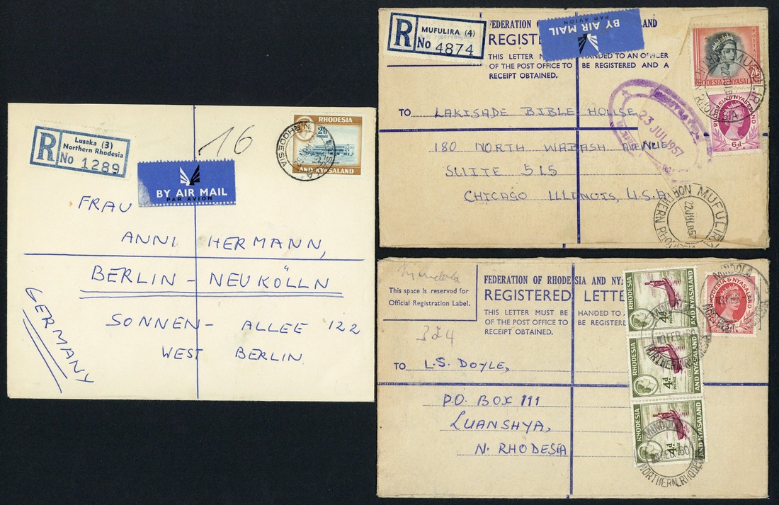 1955-63 selection of commercial covers (10, six registered) including 1955 from Parktown, 1957 from Mufulira and 1958 from Gwelo, all to U.S.A. at 2/6d. or 3/-, 1960 from Mindola to Northern Rhodesia at 1/3d., 1961 from Lujeri to Salisbury at 1/3d., 1961 from Ridgeway to Salisbury bearing coil ½d. (6, one misperforated) and 1962 to Germany at 2/6d. An interesting group