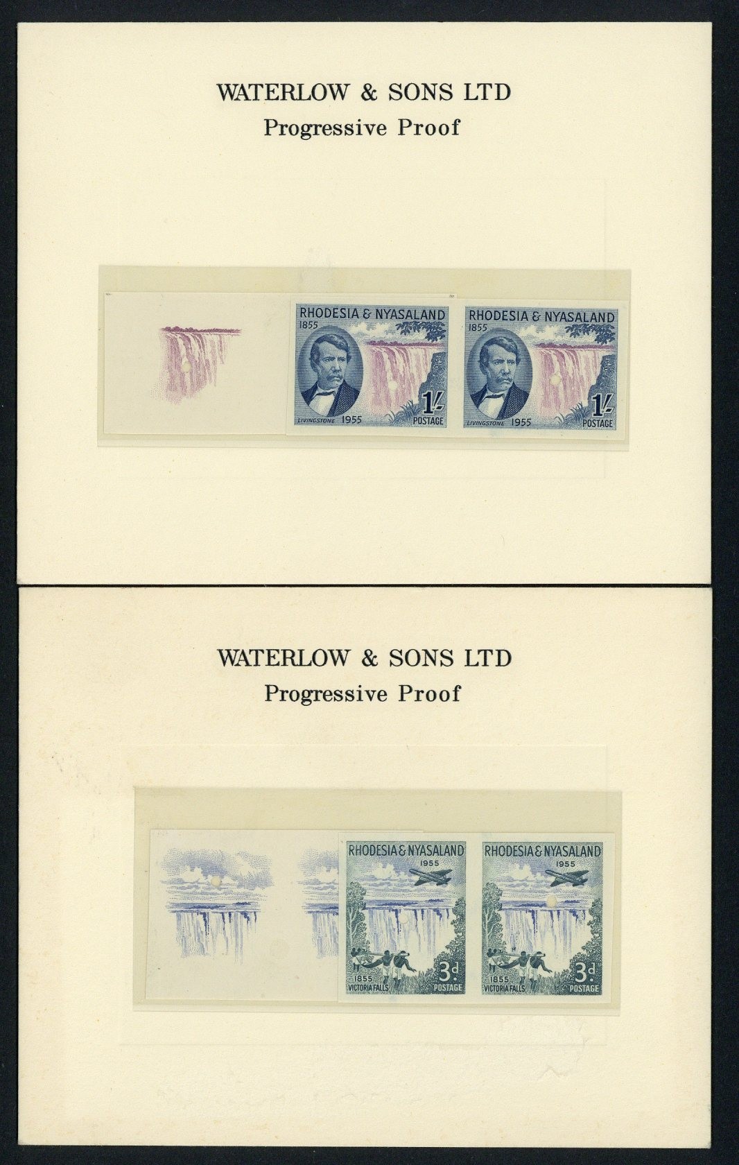 1955 Victoria Falls 3d. and 1/- imperforate plate proofs of the vignettes and complete design, all in pairs on gummed paper, each stamp with small security puncture, issued 3d. and 1/0 imprint blocks of four and 3d. upper left corner block of nine with one showing "Cannon" flaw, fine unmounted mint