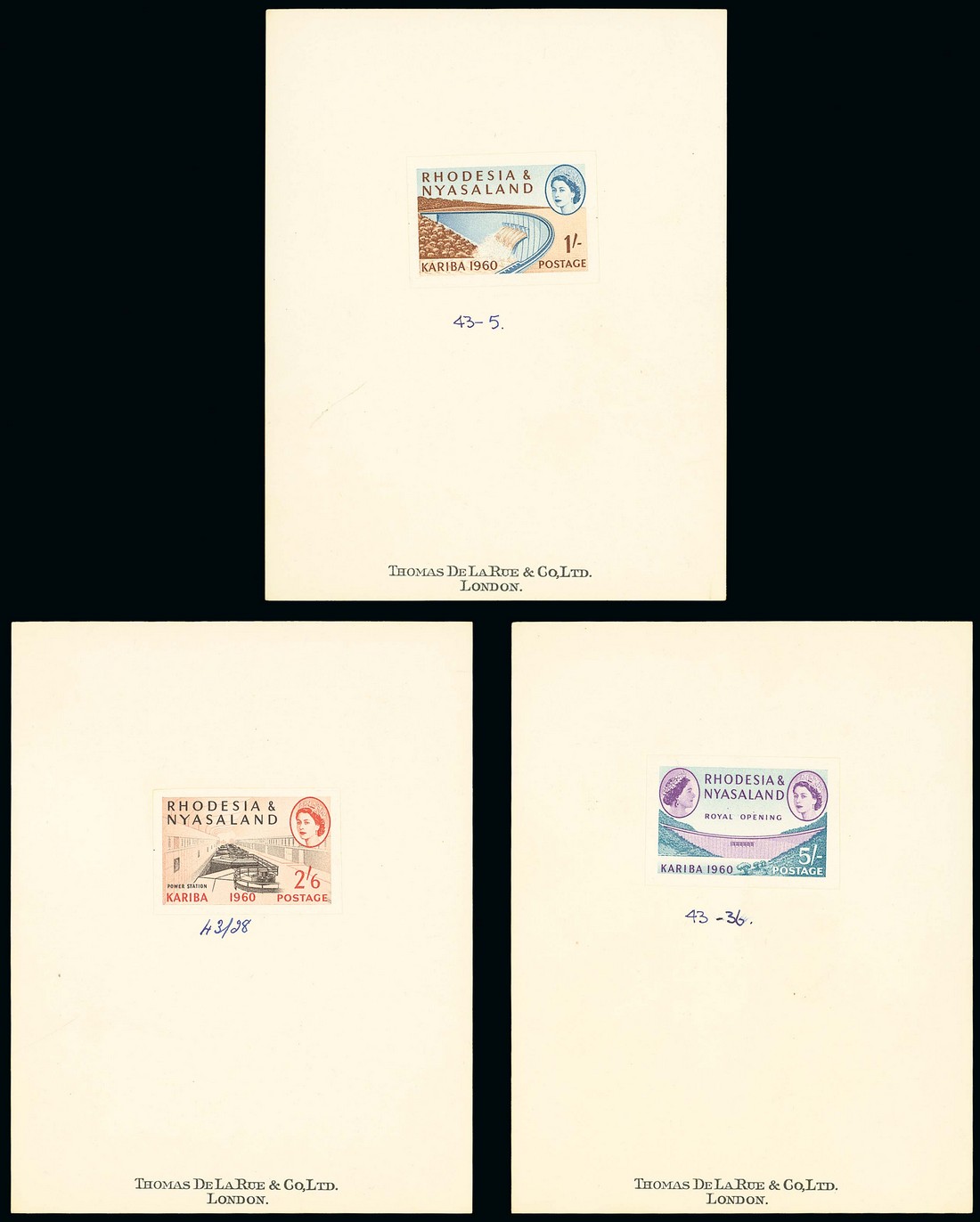 3d. to 5/- set of six imperforate proofs, the 3d. and 6d. on Harrison and Sons Ltd. presentation cards, the 1/- to 5/- on De La Rue presentation cards with manuscript numbers below each (possibly reference to colours), the 1/- in an unissued colour combination of blue and brown. An extremely rare set with only a handful of each prepared. Photo