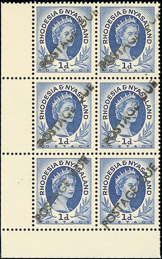1959 1d. blue handstamped "postage due" diagonally in black, a lower left corner block of six (2x3), [31-52], fresh unmounted mint; short diagonal gum bend, otherwise fine. A very rare multiple. B.P.A. Certificate (2011). Photo