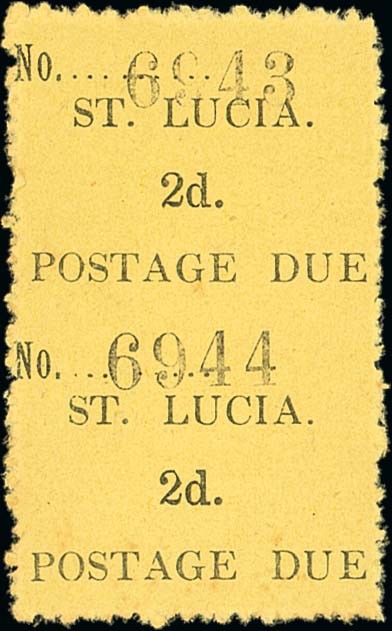 1930 2d. black on yellow vertical pair, variety imperforate between (6943/6944), unused without gum as issued; the usual rough perfs., fine and extremely rare. S.G. D2a, £8,000. Photo