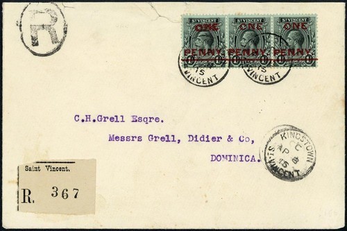1915 (8 Apr.) envelope (small faults) registered to Dominica bearing 1915 "one/penny" on 1/- black on green horizontal strip of three, the first with variety "one" double, scarce. Brandon Certificate (2010) S.G. 121, 121b. Photo