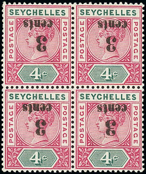 3c. on 4c. carmine and green block of four, variety surcharge inverted, fresh very lightly mounted mint. Fine and a rare multiple of this variety. S.G. 15a, £1,200. Photo