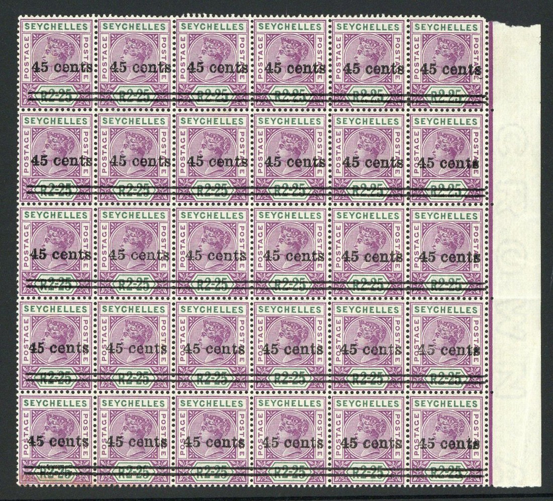 — 45c. on 2r.25 marginal block of thirty (6x5) from the right of the sheet, [19] of the setting with variety narrow "5" in "45", fresh unmounted mint; the right-hand column with a vertical crease though of fine appearance. S.G. 45, 45a, £1,650+