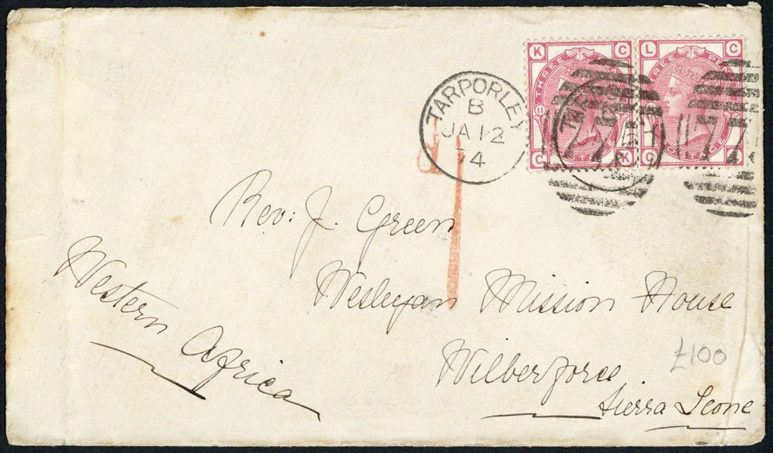 1874 (12 Jan.) envelope ex the "Rev. Green" correspondence from Tarporley to Wilberforce, bearing GB 3d. Pl. 11 pair tied by "775" duplex, showing handstruck "d1" in red and, on reverse, fine Sierra Leone double-arc d.s. (1.2)
